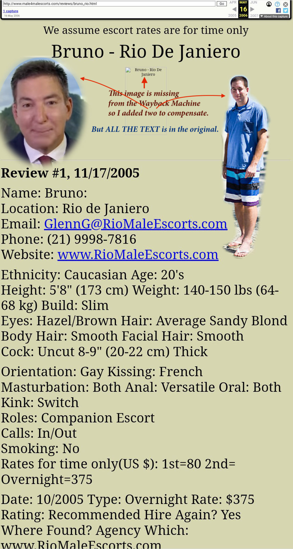 The business was also promoted through an escort review site, male4malescorts.com, with a comical mix of poor reviews and wildly enthusiastic fake reviews. One of the promotional reviews in late 2005 listed the email address of the agency as GlennG@RioMaleEscorts.com.