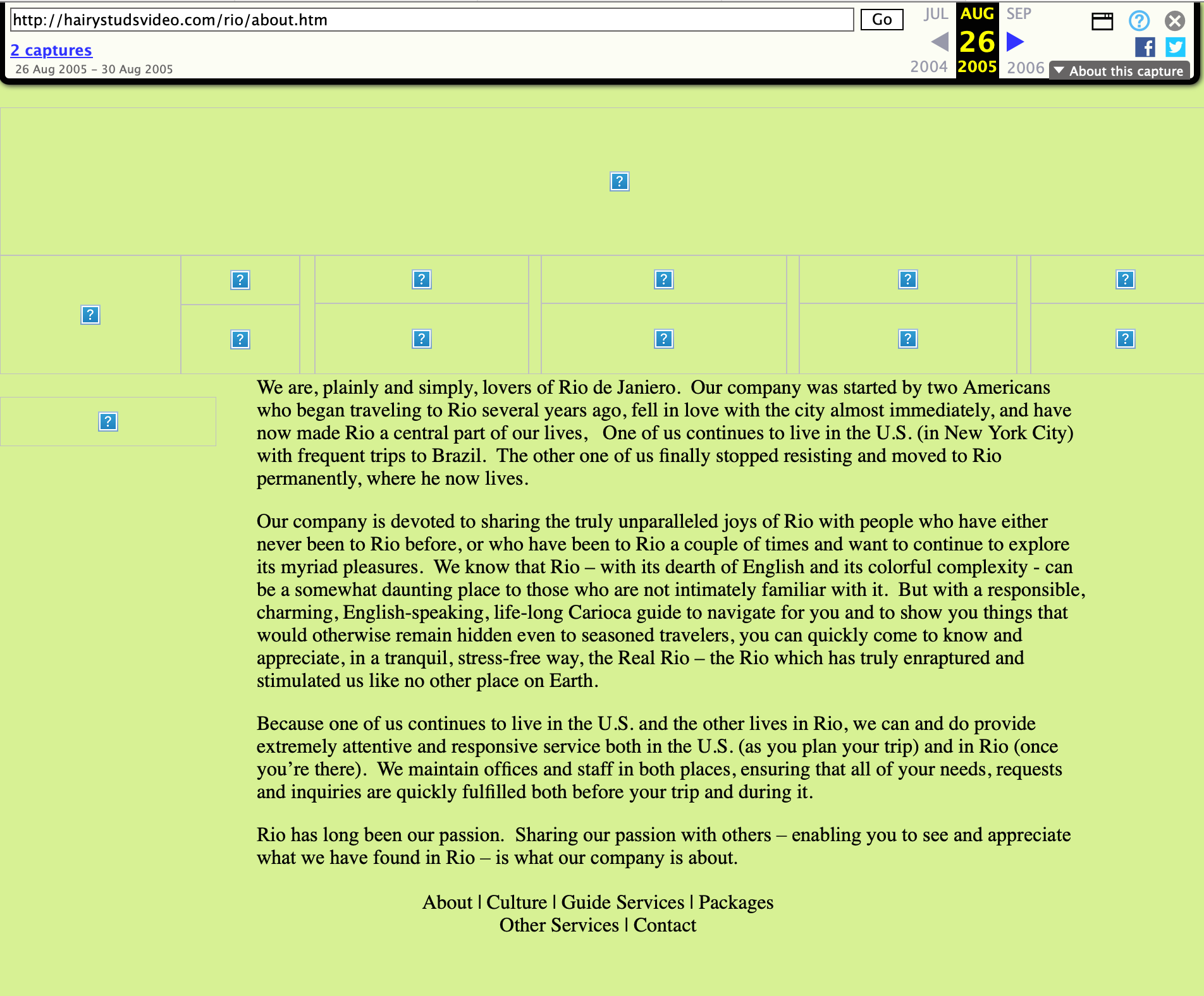 The closely linked sites RioGayGuides.com and RioMaleEscorts.com existed between 2005 and 2007 and substantial parts were preserved by the Internet Archive.